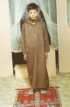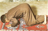 8- Böj dig ner på golvet igen och säg: ”Subhana Rabiyal Aala” tre gånger i följd. Res dig upp stående och säg ”Allahu Akbar”. Detta avslutar den första Rakat.