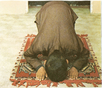 6- Säg ”Allahu akbar”. Gå ner på golvet med pannan, näsan, handflatorna, knäna, och tårna mot golvet och säg: ”Subhana Rabiyal Aala” tre gånger i följd.